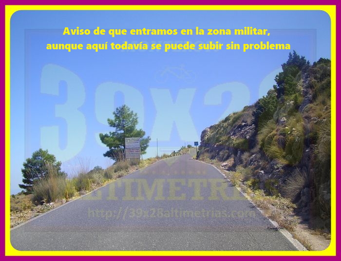 El Morrón de Espuña se eleva hasta cerca de los 1600 metros de altitud y en su cima existe una base militar, hecho motivante que nos impide completar la altimetría hasta arriba. Sí, a unos 700-800 metros de distancia hay una barrera que no nos deja pasar... Y hasta ahí está la medición: casi 22 kilómetros de ascensión a una media del 5,5%...