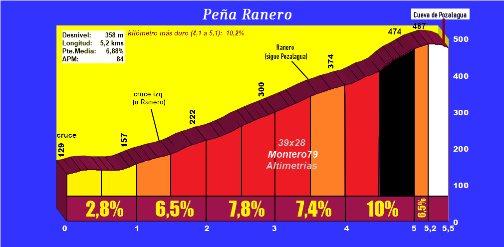 La subida en sí no reviste especial dificultad: el inicio es suave (menos del 4%) y tras unos 700 metros entramos en una zona en torno al 7--8% que llegará hasta las mismas casas de Ranero (y tras dejar el cruce a Santecilla). A partir de aquí (de Ranero) cambia la decoración, estrechándose sobremanera la carretera y nos toparemos con las rampas más duras de la subida (superiores al 15%, con 600 metros al 11,8%). Subida más abierta, más incrustada en la roca, más espectacular, hasta finalizar (no hay cartel en la cima en sí), descendiendo poco a poco hasta una amplia zona en la que se ubica un amplio aparcamiento para acceder a la cueva de Pozalagua y el Centro de Interpretación del Parque Natural d Armañón.
