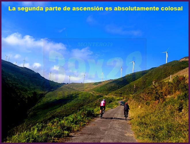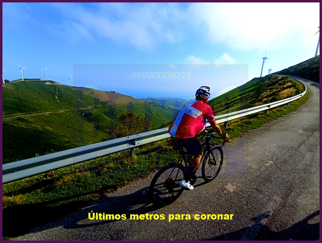 Tras un tramo de casi dos kilómetros, y poco antes de encontrar el desvío a Gallinero (otra vertiente que sube por el norte) las rampas vuelven a incrementarse, aunque la dureza se hace menor al disfrutar de unas vistas increibles sobre la costa asturiana. Peñas del Viento por La Rondiella se corona a 723 metros de altitud, tras un recorrido de 7,4 kilómetros a una pendiente media del 8,7% (muy engañosa vistos los numerosos descansillos).