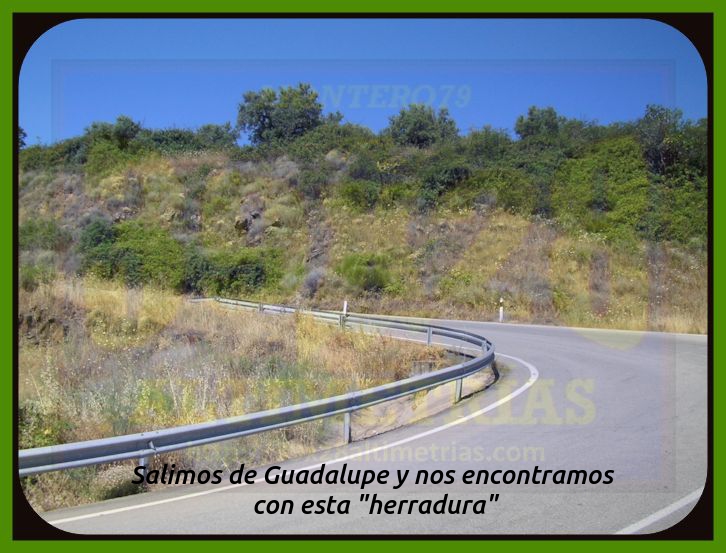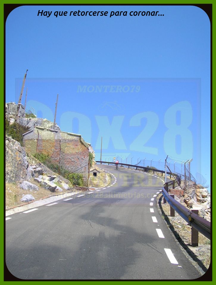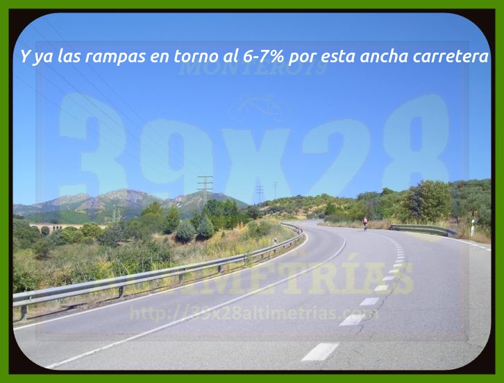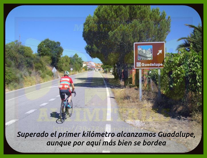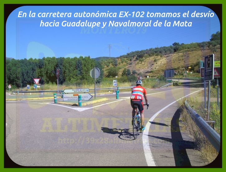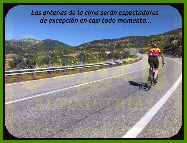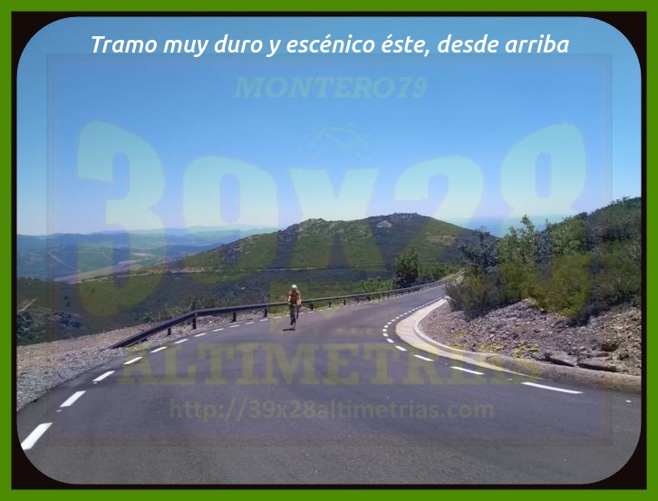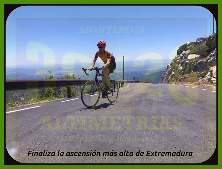Comenzamos la medición de esta vertiente del Pico Villuercas en la rotonda ubicada en la carretera autonómica EX-102 en donde tomamos dirección Navalmoral de la Mata y Guadalupe. Ya desde un principio las rampas se sitúan en torno al 6-7% por una vía ancha que incrementa la sensación de gran puerto, sumada a las alejadas antenas de la cima, que se divisan en la mayor parte de la subida. El paso por Guadalupe se efectúa por esta circunvalación, si bien existe otra carretera que se adentra en la localidad y que incrementa la longitud del puerto (y resta pendiente media). Un pequeño descansillo tras dejar Guadalupe da paso a una fuerte curva de herradura que nos enfoca hacia el collado del Humilladero, donde se encuentra la ermita del mismo nombre y también el desvío a la base militar y la parte principal de ascenso al Villuercas, la cual hoy por hoy (junio de 2020) se encuentra convenientemente señalizada kilómetro a kilómetro (con desnivel, pendiente media y máxima), lo que ayuda a todo cicloturista que no conozca en demasía a lo que se enfrenta. Una vez pasado el desvío la carretera se estrecha y la pendiente se suaviza bastante, entrando en un frondoso bosque, tramo que se prolonga hastra superar la primera zona dura. Cómoda, muy cómoda, esta parte inicial (desde el desvío), pero poco a poco la subida se endurece hasta entrar en una pequeña recta donde las rampas se van al 14% y, seguidamente, una herradura al 16% que nos "abre" completamente la subida. Cerramos aquí, en este punto, conocido como el collado del Arenal, una primera fase de ascensión, que es como hay que tomarse las cosas en un puerto de esta contundencia. Acto seguido aparece ante nosotros una tremenda recta, al fondo, y las antenas del Villuercas (todavía muy arriba), uno de los tramos más característicos de esta ascensión y que tiene como arranque el collado del Pozo de la Nieve, y donde la subida, tras una breve tregua, vuelve a incrementarse...y bastante. Rampas al 14, al 15 y hasta al 16% en una larga recta y una nueva curva de herradura que nos sitúa en otro collado más: el de la Celada, que da paso a otra fase más hasta el collado de Ballesteros, ese cuya "copla" seguramente recordarás porque será ahí donde esta carretera se encuentra con la vertiente de hormigón, la que asciende por el camino de las Acebadillas... Estamos ya en el kilómetro 14 de ascenso y ante nosotros ya sólo cabe la posibilidad de alcanzar las antenas de la cima. Tras este collado de Ballesteros parece haber una nueva tregua antes del colofón final, del apoteósico y durísimo kilómetro final, donde se suceden más rampas de dos dígitos y en donde hay que sumar todo lo que has sufrido para llegar ahí, claro. La medición finaliza en las portillas, si bien se puede continuar otros 150 metros aproximadamente, ya con un piso mucho peor, hasta el helipuerto y el vértice geodésico del Pico Villuercas para contemplar lo ascendido, que no es poco. Las vistas, como os imaginais, desde allí, son colosales, como colosal es esta ascensión, la más alta de Extremadura.