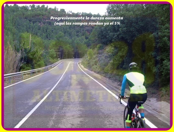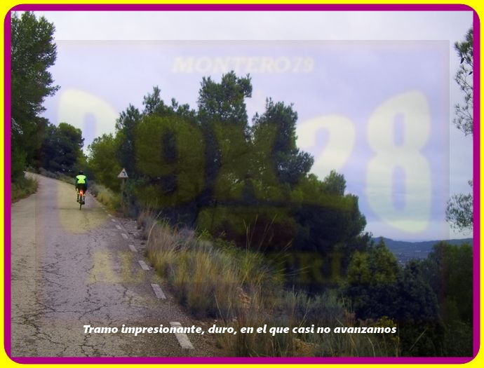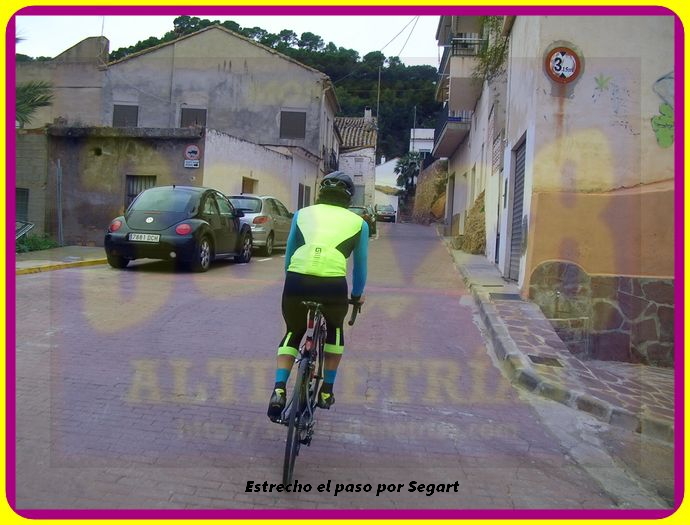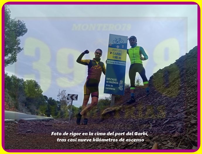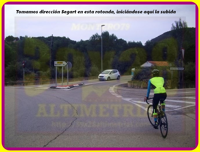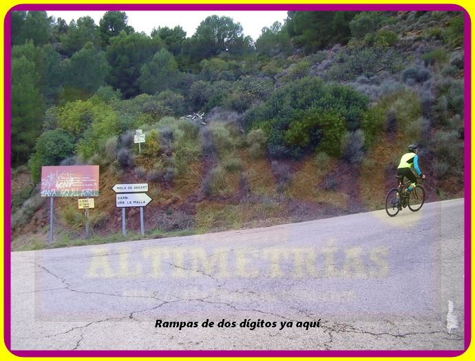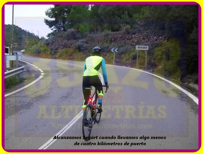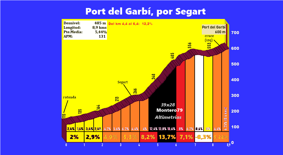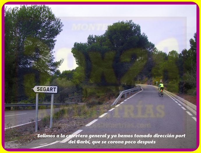 Subida en progresión en estos cuatro primeros kilómetros, los cuales transcurren por una carretera en buen estado, ancha (aunque sin arcén), con pendientes que alcanzarán en 6-7% antes de Segart. Ya allí la carretera se estrecha, dando paso al tramo "infernal" del puerto, con dos kilómetros de órdago (a más del 12% de pendiente media), rampas máximas (puntuales) que llegan al 20% y todo ello por un camino asfaltado (bien asfaltado), que fue escenario del "combate ciclista" entre Froome, Nibali y Contador en la Vuelta a España de 2017... Un pequeño descansillo mediada la subida cortará el ritmo y bajará la media, y nos lleva a una zona más árida, incómoda para los que prefieren subir a ritmo. Esta combinación de "rampón-descanso" se sucederá ya, casi, hasta el cruce con la carretera que conecta el port del Garbí (a la izquierda) con el Mirador (a la derecha). Tras girar a la izquierda nos quedarán poco más de 200 metros para coronar el port del Garbí. Dicho puerto cuenta 8,9 kilómetros a una pendiente media del 5,4% (muy engañosa) y bien puede enlazarse consigo mismo tras ascender Oronet y bajar por la Frontera, e ideal para finales en Sagunto (como en la mencionada Vuelta 2017) o Valencia o...