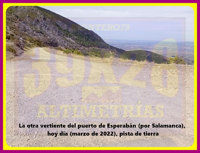 Tras casi 22 kilómetros de ascenso alcanzamos la cima del puerto de Esperabán y finaliza el asfalto, puesto que por Salamanca, el puerto es de tierra... Una lástima con vistas a enlazarlo, por ejemplo, con el puerto del Robledo (y las Batuecas). Es lo que nos ocurre con tantos y tantos puertos de la península y estas situaciones tan incomprensibles: Esperabán se une a los Farrapona, Vegarada o Cubilla, con asfalto en una provincia y tierra en la otra.