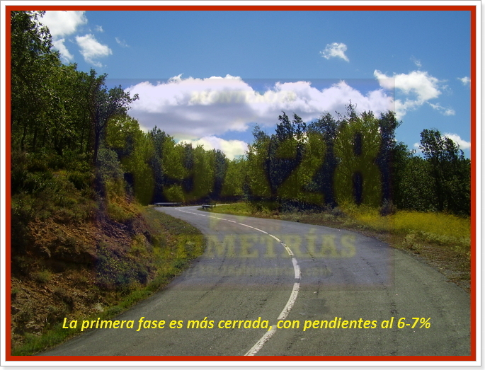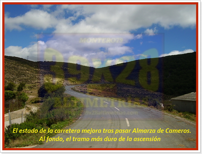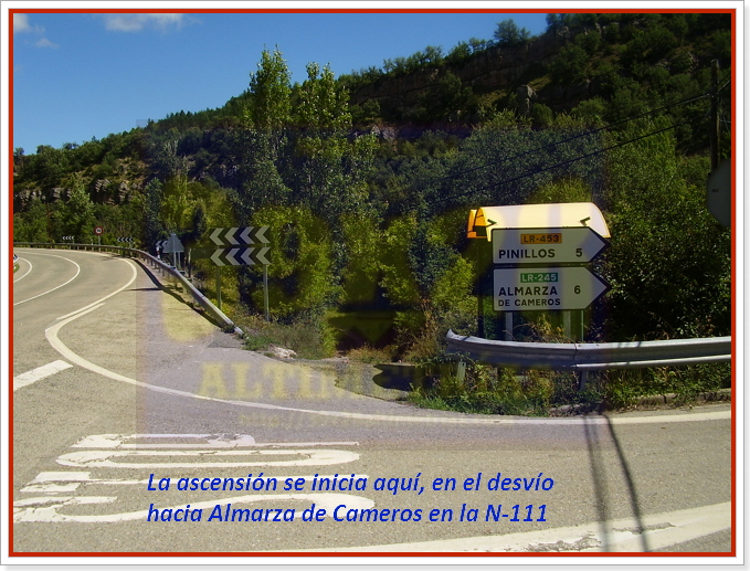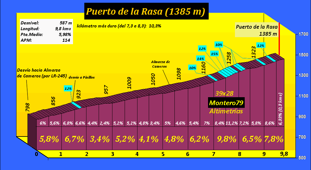 Estamos en la Tierra de Cameros para ascender la vertiente oeste del puerto de La Rasa. Leí en cierta ocasión que la Vuelta a La Rioja, cuando lo incluía en su recorrido, solía catalogarlo como de primera categoría, por lo que no me fiaba en exceso de los perfiles altimétricos que había visto. La Rasa tiene un bello inicio, casi escondido, un puerto de esos que parece que no quiere meter ruido... Tras dejar atrás la carretera N-111 y el puente sobre el río Iregua nos toparemos con un cartel donde se nos indica que esto sí, esto es el puerto de la Rasa. El arranque es brusco, con una herradura cargada de dureza, agravada aún más por el estado del asfalto, más irregular en estos primeros compases. Pendientes más bien regulares, entre el 5 y el 7%, hasta el desvío a Pinillos. Poco a poco la ascensión se irá haciendo "más grande", más abierta, divisando largos tramos y Almarza de Cameros, claro, la única localidad que atravesaremos a lo largo de la ascensión. Será a partir de ahí, de dicha localidad, en donde el estado de la carretera mejore notablemente. Pero estamos expectantes porque aún queda el tramo más duro del puerto, que se divisa bien, pues al fondo se ve la trazada de la carretera intuyendo que aquello puede tratarse de varios rampones. Una señal del 9% previa a la primera herradura de este tramo marca el inicio de la zona dura del puerto,con varias herraduras que aún le dan más vistosidad.