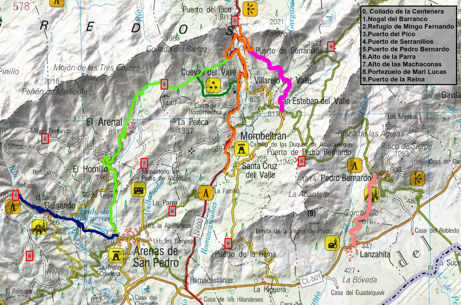 su mayoría, en la web: collado de la Centenera (por Arenas de San Pedro, por los Collaritos, por Cuevas del Valle), Nogal del Barranco, Refugio de Mingo Fernando, puerto del Pico (por el sur o por el Sidrillo), puerto de Serranillos (por Santa Cruz del Valle), puerto de Pedro Bernardo (por Pedro Bernardo, por Lanzahita o por la carretera antigua), alto de la Parra (este y oeste), alto de las Machaconas (este y norte), el Portezuelo de Mari Lucas y el puerto de la Reina. Muy posiblemente se queden en el tintero varios, pero gustosamente se añaden a nuestros argumentos...