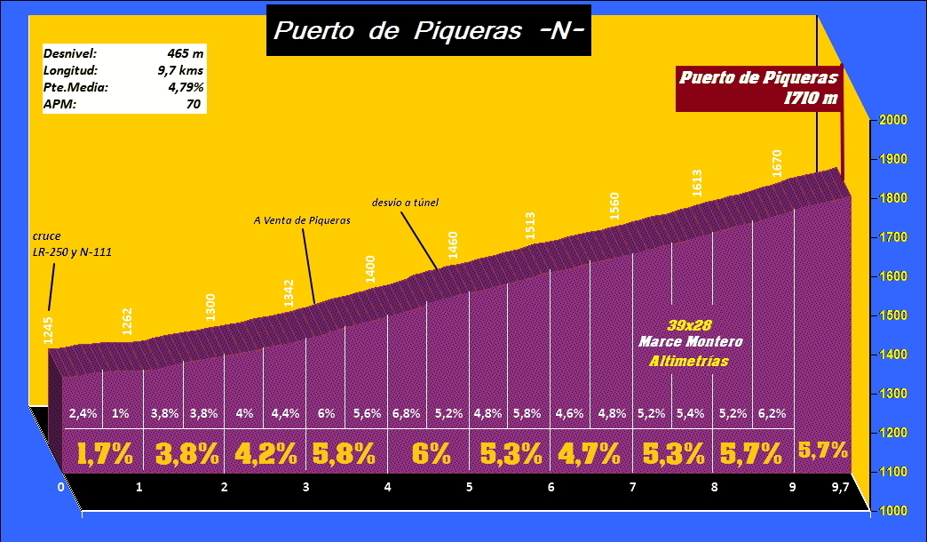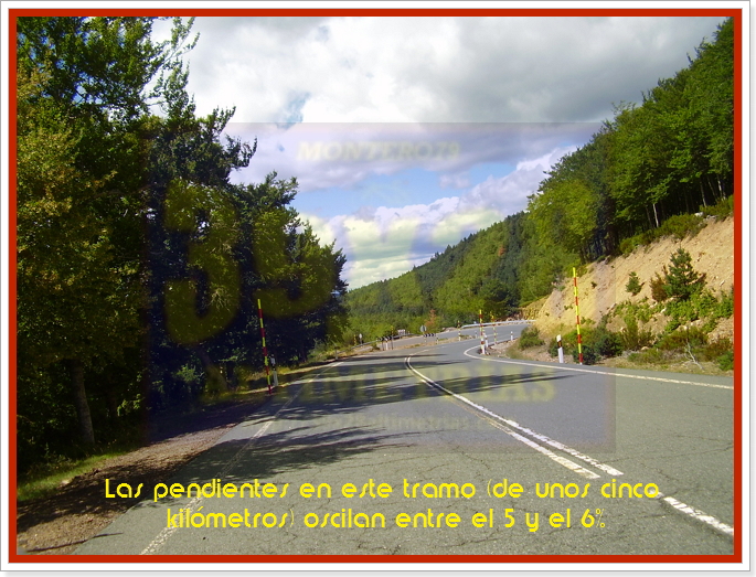 La ascensión transcurre por un asfalto impecable (os recuerdo que es la N-111), y con tráfico hasta los 5 kilómetros definitivos (a partir del desvío al túnel mengua ostensiblemente), con pendientes muy suaves en el primer kilómetro (menos del 3%), aunque a partir del segundo (kilómetro) las rampas ya se van a incrementar hasta el 5-6%. Largos tramos rectos, mucha vegetación, en la primera fase, hasta que, como ya os decía, llegamos al desvío al túnel y la ascensión se convierte en un "pequeño Alpe D'Huez", con varias curvas de herradura (con rampas mucho más suaves que las del mítico coloso francés), y se vuelve mucho más entretenida. Piqueras finalizará tras 9,7 kilómetros, a 1710 metros de altitud.