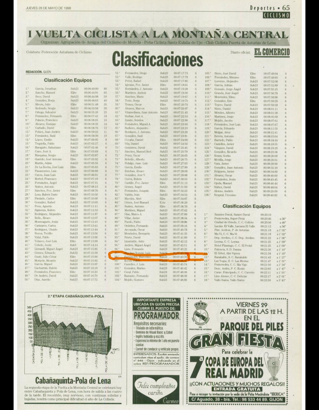 Aquí a la izquierda tenéis la única imagen que aún se conserva de la mítica contrarreloj con la que se abría la Vuelta a la Montaña Central de 1998, y en la que hice un destacadísimo puesto 98, y todo a pesar de no dormir apenas la noche anterior, de estudiar, de tener catarro, de contraer numerosos virus, de no tocar la bici en los días anteriores, de jugar a fútbol durante 5 días consecutivos, de echar novia, de no salir de las pastelerías de la Pola en la semana anterior y de cuantas excusas a usted se le pasen por la imaginación en estos mismos momentos.