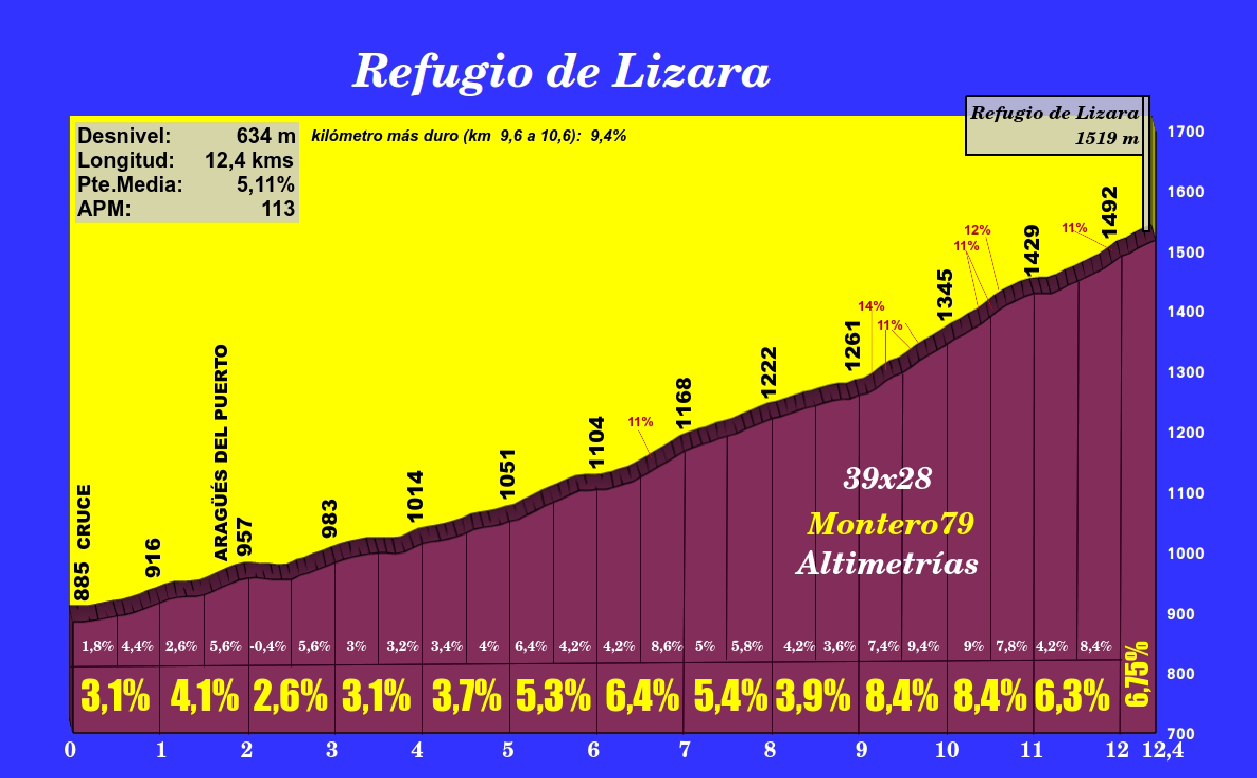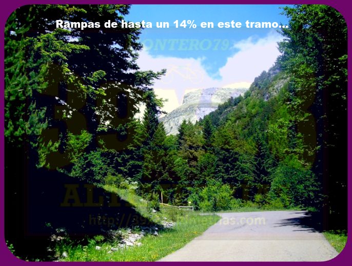 Comenzamos la medición a la altura del cruce entre la carretera que se dirige a Jasa con la de Aragües del Puerto, siendo los primeros compases de ascensión más bien suaves y con carretera ancha, pero poco antes de Aragües del Puerto se estrechará, siendo ya así la tónica predominante hasta la cima. La primera fase de la ascensión podríamos situarla hasta el puente sobre el río Osia, donde cambiaremos de ladera, atravesando zonas de bosque muy frondoso (ojo a las fotos). El tramo más característico del puerto llegará a partir del kilómetro 9, cuando atravesamos varias herraduras mientras la carretera se va despejando de vegetación a ritmo de rampas francamente duras (el kilómetro más duro está aquí y llega al 9,4%, además de varias rampas de hasta un 14%). La dureza se mantendrá ya hasta el mismísimo refugio, con un fondo rocoso sublime coronado por el pico Bisaurín ( a 2670 metros de altitud) y que nos recuerda a otros colosos pirenaicos con muchísima más fama ciclista.