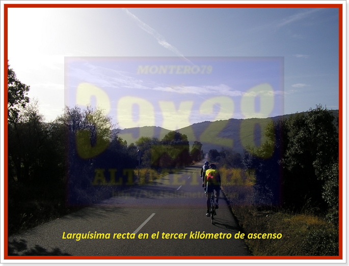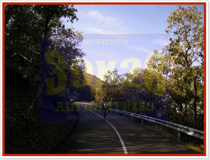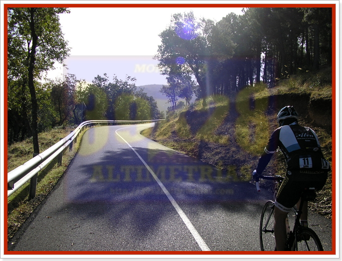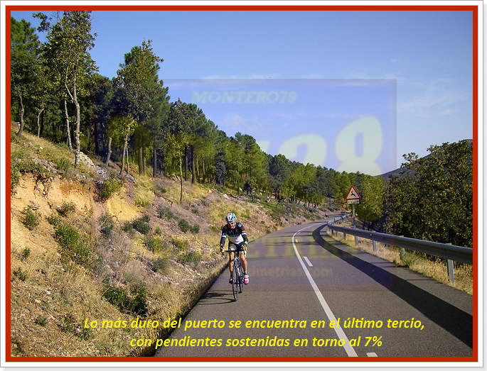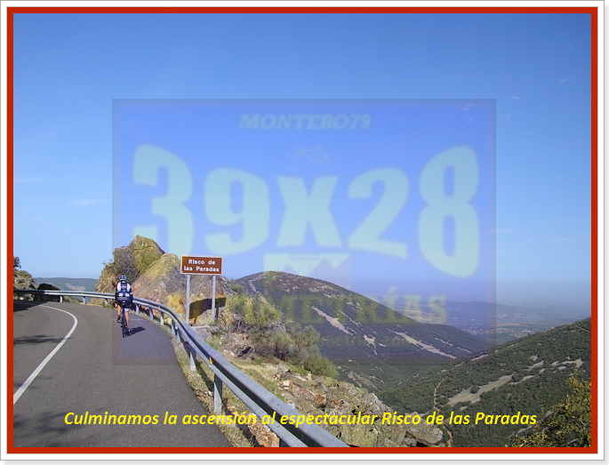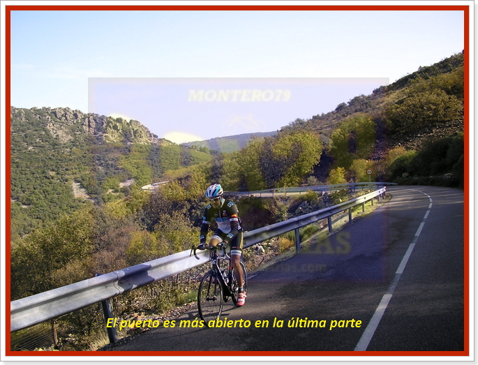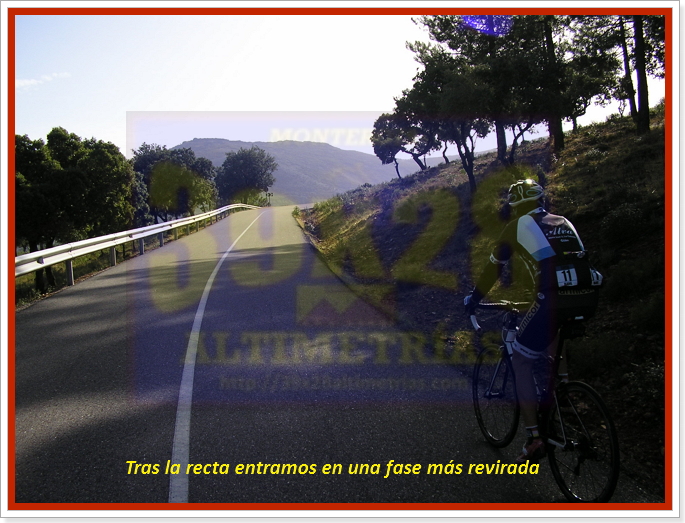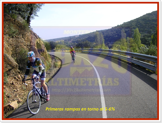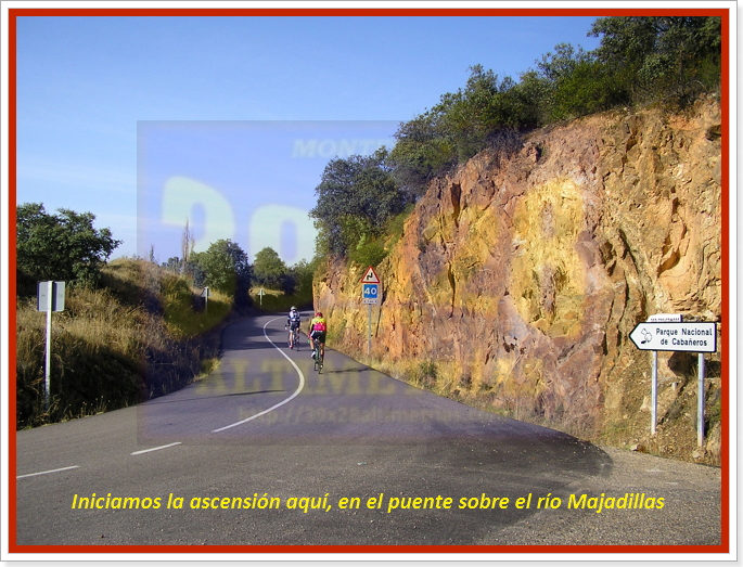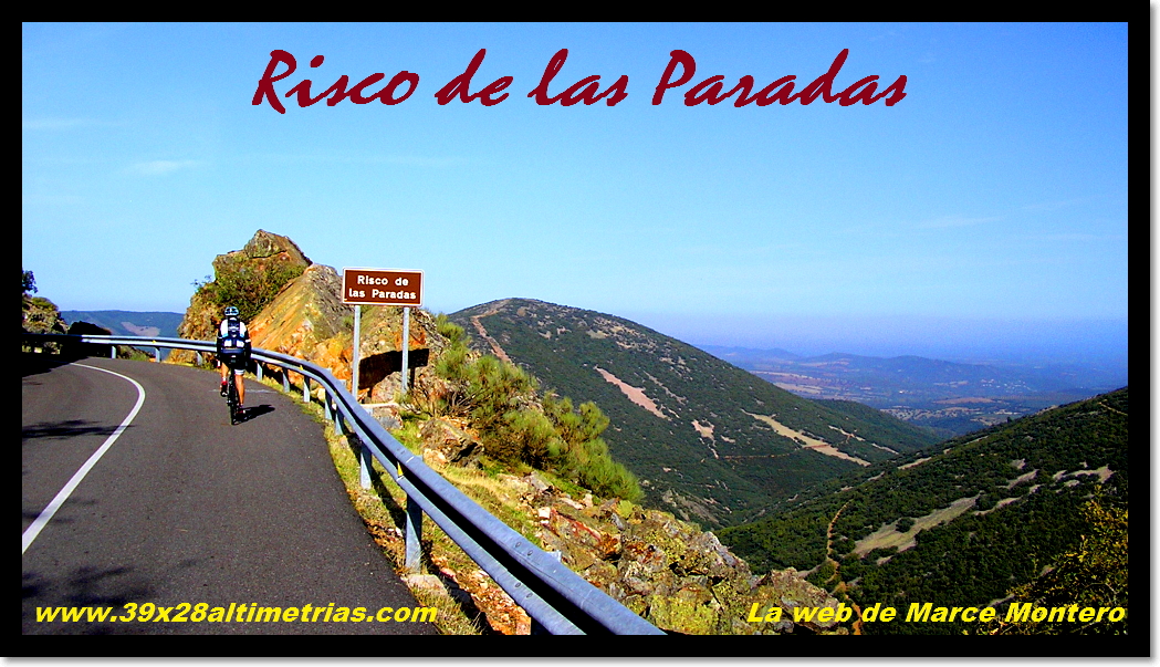 Arrancamos la ascensión cerca de Navahermosa, en una carretera a la que hemos accedido tras dejar la autonómica CM-401 y descender hasta el puente sobre el río Majadillas, pasado el cual un cartel nos indica hacia el Parque Nacional de Cabañeros, por donde transitaremos durante varios kilómetros. El inicio, remontando el río, ya sitúa las pendientes en torno al 6-7%, hasta que alcanzamos una especie de meseta que atravesaremos con una larguísima subida donde se encuentra el desvío a Hontanar. Hay que destacar que también podremos afrontar este Risco de las Paradas desde ahí, desde Hontanar y la carretera que une esta localidad con Navahermosa. Sin embargo hemos optado por la vía principal, que, tras la mencionada recta vira a la izquierda y se sumerge en la arboleda durante varios kilómetros, con pendientes "agradables" (sobre el 5%). El Risco es un puerto más bien llevadero, más aún con el asfalto que luce ahora (noviembre-2016), que poco tiene que ver con lo de hace unos años...