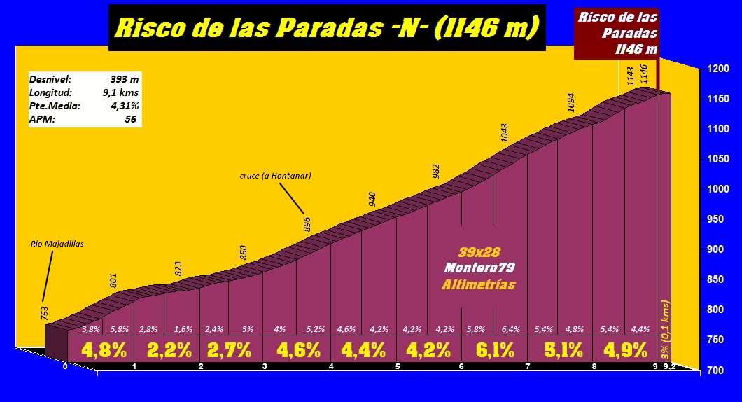 La ascensión se "abre" en sus dos últimos kilómetros, lo que se suma a las pendientes más duras del puerto, dando una sensación de gran subida cicloturista. Este Risco de las Paradas se culmina tras 9,1 kilómetros de ascenso, si bien en el perfil indico hasta el mirador del Risco (donde hay espacio suficiente para encajar una meta de un hipotético final...).