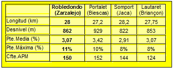 Lo que podéis ver abajo es un cuadro comparativo con los datos más significativos de puertos similares en cuanto a distancia y desnivel, y que son utilizados a menudo en las grandes vueltas: