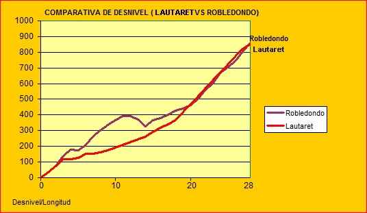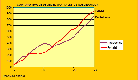 Cuando os presenté, hace unos días, el reportaje del alto de Robledondo por Zarzalejo dejé caer que se trataba del "Portalet" madrileño, algo que a muchos sonaría, sin duda, a casi una herejía. La vertiente a la que me refería era la española, con menos desnivel y una pendiente media que ronda el 3%. Robledondo sería un encadenado de ascensiones, dos a grandes rasgos, con alguna zona dura, pero tremendamente irregular... Pero presentaría un desnivel acumulado total próximo a los 1000 metros, lo que lo convierte en un Primera categoría (de forma global, con los 28 kilómetros). Veamos una comparativa de desnivel entre Robledondo y Portalet (por Biescas):