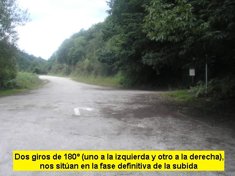 Desde la ascensión al alto de Padrún por Olloniego arranca una carretera que nos conduce al pozo Olloniego. Sin apenas tráfico, casi escondida (la mayor parte transcurre bajo un "manto verde"), la subida a San Frechoso también puede iniciarse en Olloniego, desviándose al poco de arrancar la subida al Padrún. Apenas hay trascendencia entre empezar en un lugar u otro, ya que la parte dura es común en ambas, confluyendo estas carreteras en el kilómetro 0,65 (no lo indiqué en la altimetría, pero es al principio de la medición). Pasado el pueblo de La Güeria la subida toma un cariz ya más serio, con rampas que alcanzan el 13%, preludio de lo que nos deparará poco después... Tras pasar la mina (daremos dos giros de 180º, como veis en las imágenes, siguiendo los carteles que nos indican "Oviedo Aventura"), la carretera se estrecha de tal manera que podemos "cruzar los dedos" para no encontrarnos con ningún vehículo que nos obligue casi a parar, ya que la sucesión de pendientes duras no da tregua... Al 15, al 17 e, incluso, al 19%... No se ve reflejada esta dureza, como vemos, en la pendiente media, debido a la irregularidad de la subida (rampón+descanso). La ascensión a San Frechoso culminará con una terrible rampa (19%) que nos sitúa junto a la ermita de San Lorenzo.