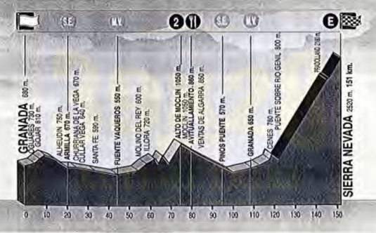 | 4 de septiembre de 2022 (15ª etapa de la Vuelta a España 2022) DESNIVEL: 4100 m DISTANCIA: 149,6 kms. PUERTOS: El Castillo, Monachil, Sierra Nevada Cinco