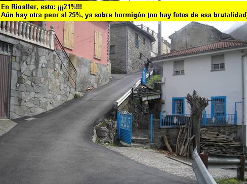 Comenzamos la medición, como ya dije antes, en la localidad de Casomera, en el puente sobre el río Aller, es decir, a la salida de dicha población. Los primeros kilómetros, hasta Rioaller, son una combinación de repechos realmente duros (rampas que sobrepasan el 10%) con tramos de descenso que influyen en que la pendiente media sea algo engañosa. Atención, sobre todo, al espectáculo que nos tiene reservada la ascensión cuando llevamos poco más de 2,5 kilómetros: las impresionantes Foces de Rioller. Una maravilla de la naturaleza, un espectáculo para el que no es necesario pagar. Sólo pedalear (en nuestro caso) y admirar. Pero cuando salimos de ahí nos encontramos con un tremendo muro que alcanza el 15%. Es el aperitivo de lo que vendrá más tarde… Un suave descenso de unos 100-200 metros nos sitúa en Rioaller, donde da inicio la fase final de la ascensión. Aún en asfalto (impecable, por cierto) vamos atravesando las caleyas del pueblo y la pendiente se va incrementando de manera abrupta. Hasta un 21% (ver foto) llega a marcar el altímetro. ¡Y aún estamos a más de 8 kilómetros de la cima! Pero hay más, mucho más. En plenas caleyas cambiamos el asfalto por el hormigón, rayado, que lo estrenaremos de la “mejor” forma posible: con una brutal rampa del 25% (habéis leído bien). No recuerdo un pueblo tan empinado como éste… Y, finalmente, salimos de Rioaller para encaminarnos, en un principio, en hormigón hacia el puerto de Vegarada. Ahora la ascensión transcurre casi escondida por el bosque. Así serán los siguientes 4 kilómetros, hasta el Mayéu Carbayalín: una buena forma de esconder el tramo más duro. La pendiente media de esa zona es de un 12% y se salvan varios “muros” al 18, al 22 e, incluso, otro, más arriba, al 25%, agravados por el estado de la pista, en muchos casos, bastante irregular, con mucha piedra suelta,… Esta fase culmina, como ya he señalado más arriba, en el Mayéu Carbayalín, en donde la pendiente se reduce bruscamente y prácticamente llaneamos. Un respiro de medio kilómetro para reponer fuerzas ante la irregular parte final. Es, a partir de ahora cuando la subida se “abre” completamente y podemos contemplar casi la cima y buena parte de los kilómetros que nos quedan para culminar, un paisaje majestuoso al nivel de los puertos alpinos. Y retomamos la dureza, rampas al 15-16% (algo más), curvas de herradura, pero ahora la discontinuidad es la nota predominante, ya que las dificultades se ven combinadas con zonas más suaves. Los dos últimos kilómetros, ya más suaves (entre el 5 y el 7%), transcurren casi en línea recta en busca de las cabañas ganaderas situadas en los puertos de Vegarada. La ascensión finaliza poco después de pasar el mayau en que se encuentran las mismas. Desde ahí un suave descenso de casi un kilómetro para desembocar en el asfalto de la vertiente leonesa de Vegarada.