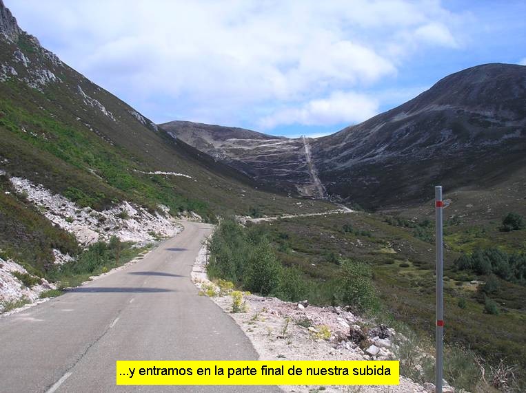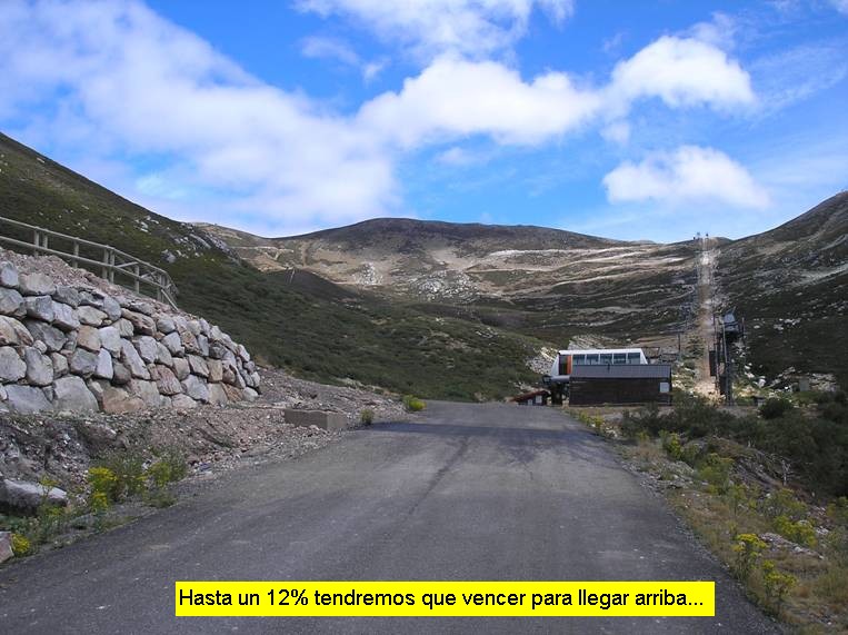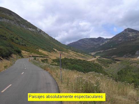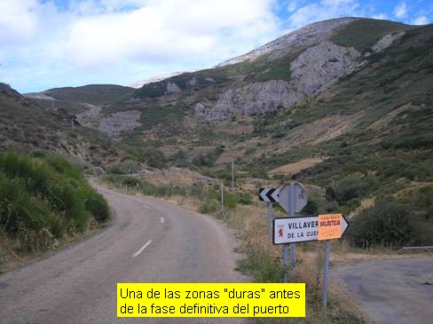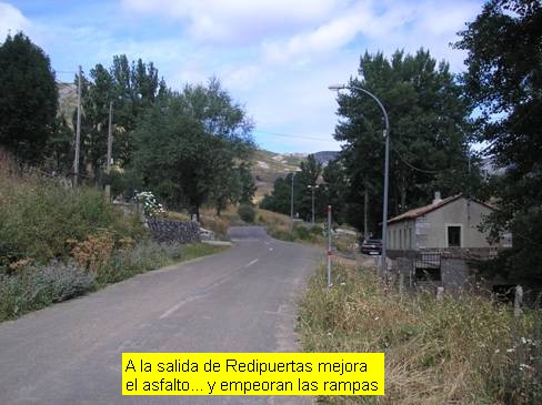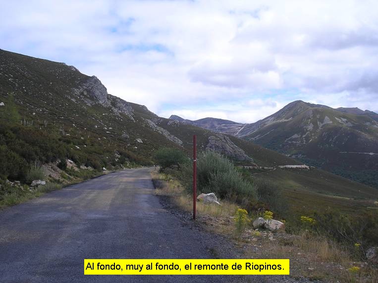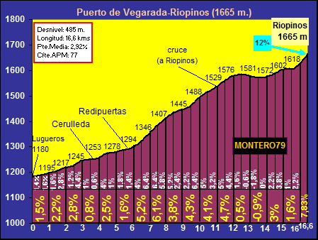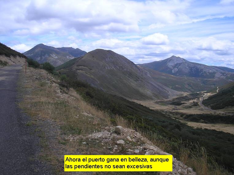 El comienzo del puerto podríamos situarlo perfectamente en la localidad de Redipuertas, a unos 6 kilómetros de la cima, aunque la carretera ya tiene pendiente ascendente, muy leve, desde bastante más atrás. En este caso concreto comencé la medición en la localidad de Lugueros (pero ya desde la Vecilla la carretera va cogiendo altura). Poco nos hará apreciar que estamos ante un puerto de montaña. La carretera discurre entre amplias rectas y las pendientes son levísimas (en pocas ocasiones sobrepasan el 5%). Pero en cuanto llegamos a Redipuertas, tras algo más de cinco kilómetros, el asfalto cambia (a mejor) y parece que la ascensión empieza a ponerse seria. Sí, ahora sí, durante unos 3 kilómetros las rampas son respetables y la senda se muestra bellísima, con amplios zigzagueos. Los paisajes son magníficos y pronto nos evocan a esos colosos alpinos. Cuando estamos próximos a coronar Vegarada y la pendiente ha vuelto a recuperarse hasta situarse en torno al 5-6% encontramos una carretera que se desvía hacia la derecha y que asciende a Riopinos (está a unos 300 metros de la casa del puerto) y optamos por continuar nuestro camino por ahí en busca de más y más escalada. Aquí las ruedas ya no tan deslizan con la facilidad del tramo anterior puesto que hay bastante gravilla suelta y el asfalto es bastante más rugoso (la anchura de la carretera, sin embargo, continúa siendo muy amplia). Tras un prometedor inicio, con un kilómetro a casi un 5% de media, la pendiente decae por completo y durante casi 3 kilómetros transitamos por una zona de toboganes muy suaves. Ello nos permitirá disfrutar de un paisaje excepcional con vistas sobre el ascenso realizado. Las dificultades vuelven en el tramo final, cuando ya estamos casi metidos de lleno en el remonte de Riopinos, donde nos espera una fuerte rampa que alcanza el 12%.
