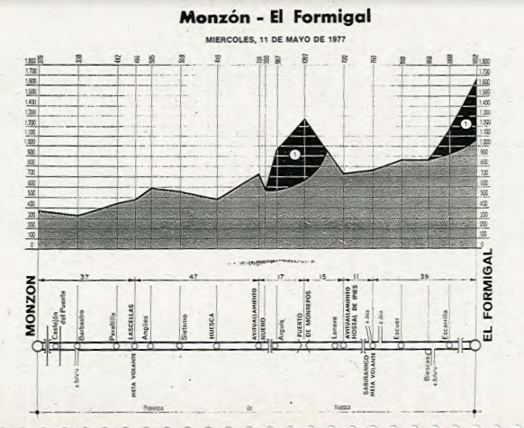 En 1975 se disputa la etapa de mayor desnivel (Perves, Espina, Foradada y Cotefablo antes de Formigal, y una distancia de 233 kilómetros) que alcanza la estación de esquí oscense, de nuevo hasta la urbanización (cota 1650 metros).