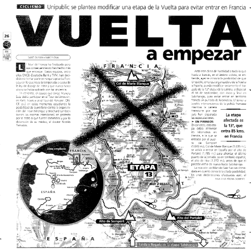 El contexto en el que se desarrolla la Vuelta a España de 1998 es el del Escándalo Festina y el abandono de los equipos españoles durante la disputa del Tour de Francia. La organización quiere evitar imágenes similares a las del Tour y opta por modificar el recorrido de una de las etapas que se presumía clave. La idea es no pasar a Francia por miedo a las actuaciones judiciales...