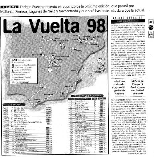 UNIPUBLIC presenta el recorrido de 1998 durante la disputa de la Vuelta '97 y el diario Mundo Deportivo señala que la etapa Sabiñánigo-Sabiñánigo reproducirá el recorrido de la popular Quebrantahuesos, esto es, con los puertos de Somport, Marie Blanque, Portalet y Hoz de Jaca.