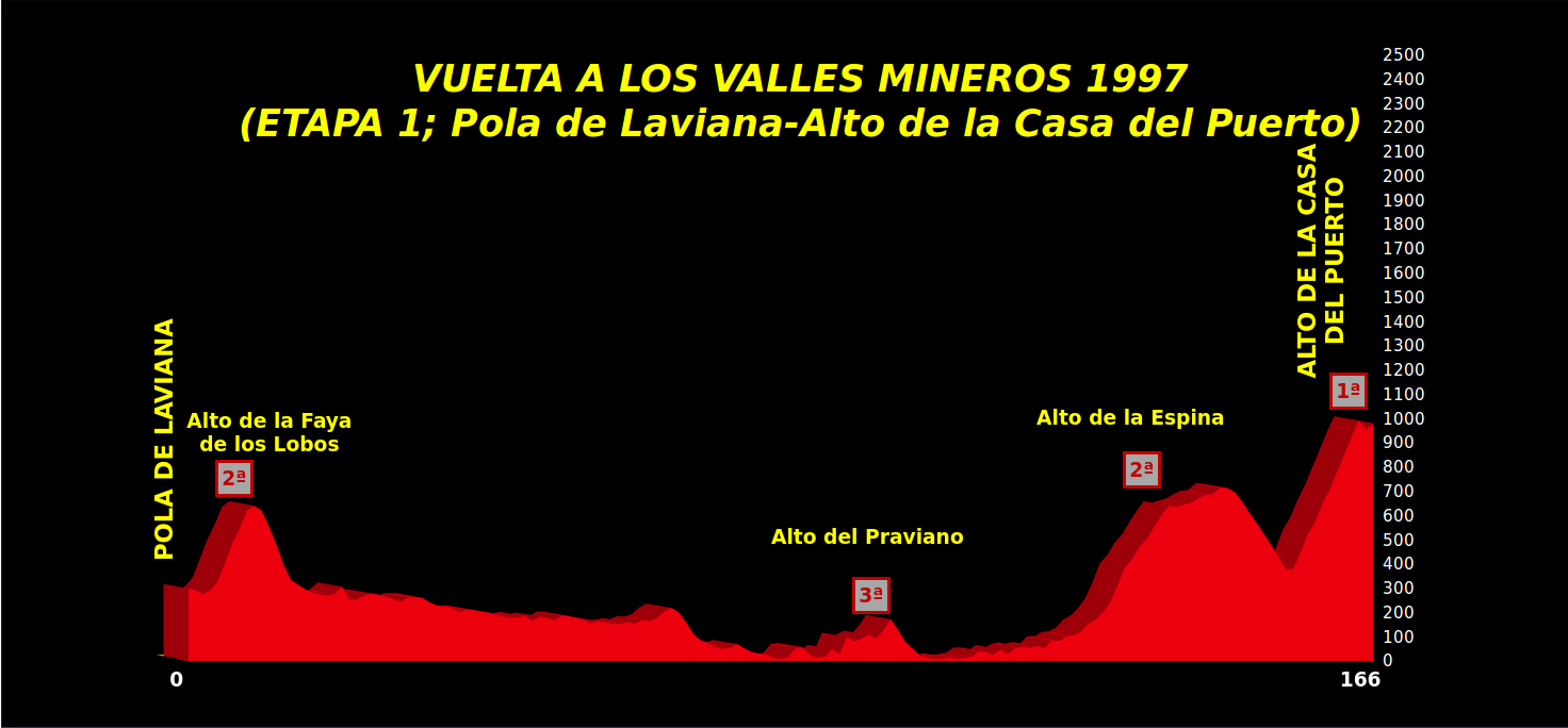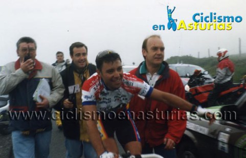 CRÓNICA: La primera etapa de la Vuelta de 1997 se disputó entre Pola de Laviana y el alto de la Casa del Puerto, ascensión que se localiza en Tineo y que fue todo un clásico en las últimas ediciones de la carrera. Se pasan los altos de Faya de los Lobos (2ª), Praviano (3ª), La Espina (2ª) y la Casa del Puerto (1ª, desde el Rodical). En la cima tinetense vence el corredor asturiano José Manuel "Coque" Uría, quien se colocará, también, como líder de la carrera. Uría competía en el conjunto Café Toscaf en aquella edición de la Vuelta, en la que también estaban en liza equipos como ONCE, Euskadi, Banesto, TVM,...