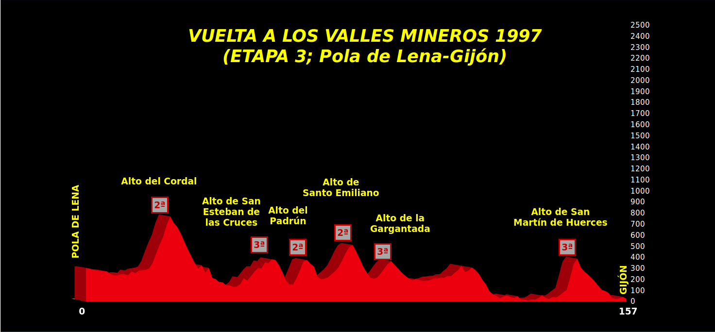 En 1997 se disputó, por última vez, la Vuelta Ciclista a los Valles Mineros. Fue entre los días 2 y 5 de junio cuando tuvo lugar, coincidiendo con las últimas etapas de un Giro de Italia que vivía un intenso duelo entre Pavel Tonkov e Ivan Gotti.